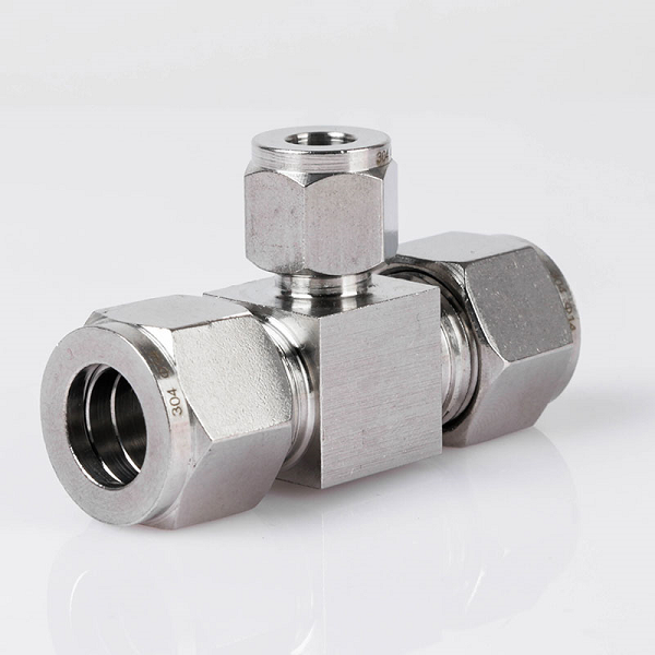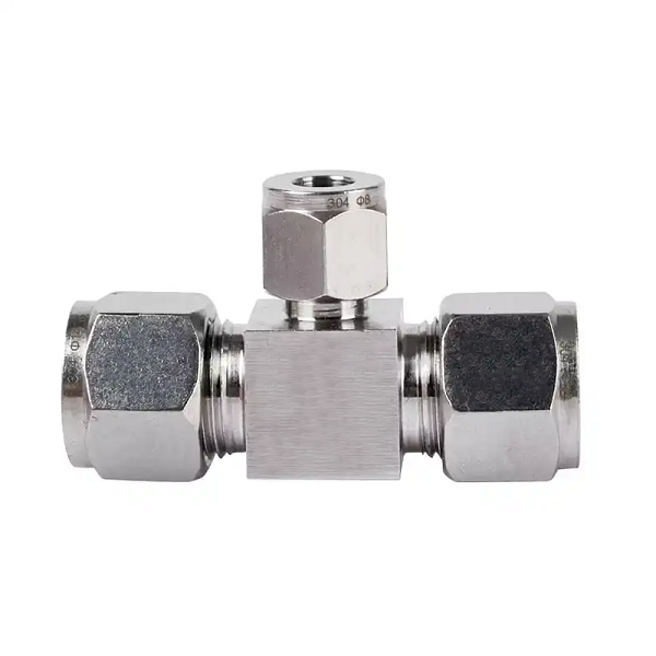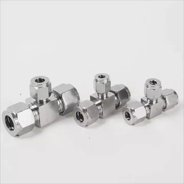 1. Hình ảnh sản phẩm Đầu nối Inox 304 dạng chữ T giảm có 3 đầu nối siết ống khí nén: